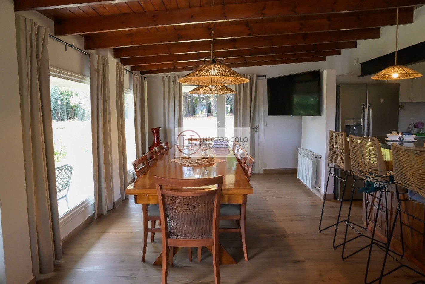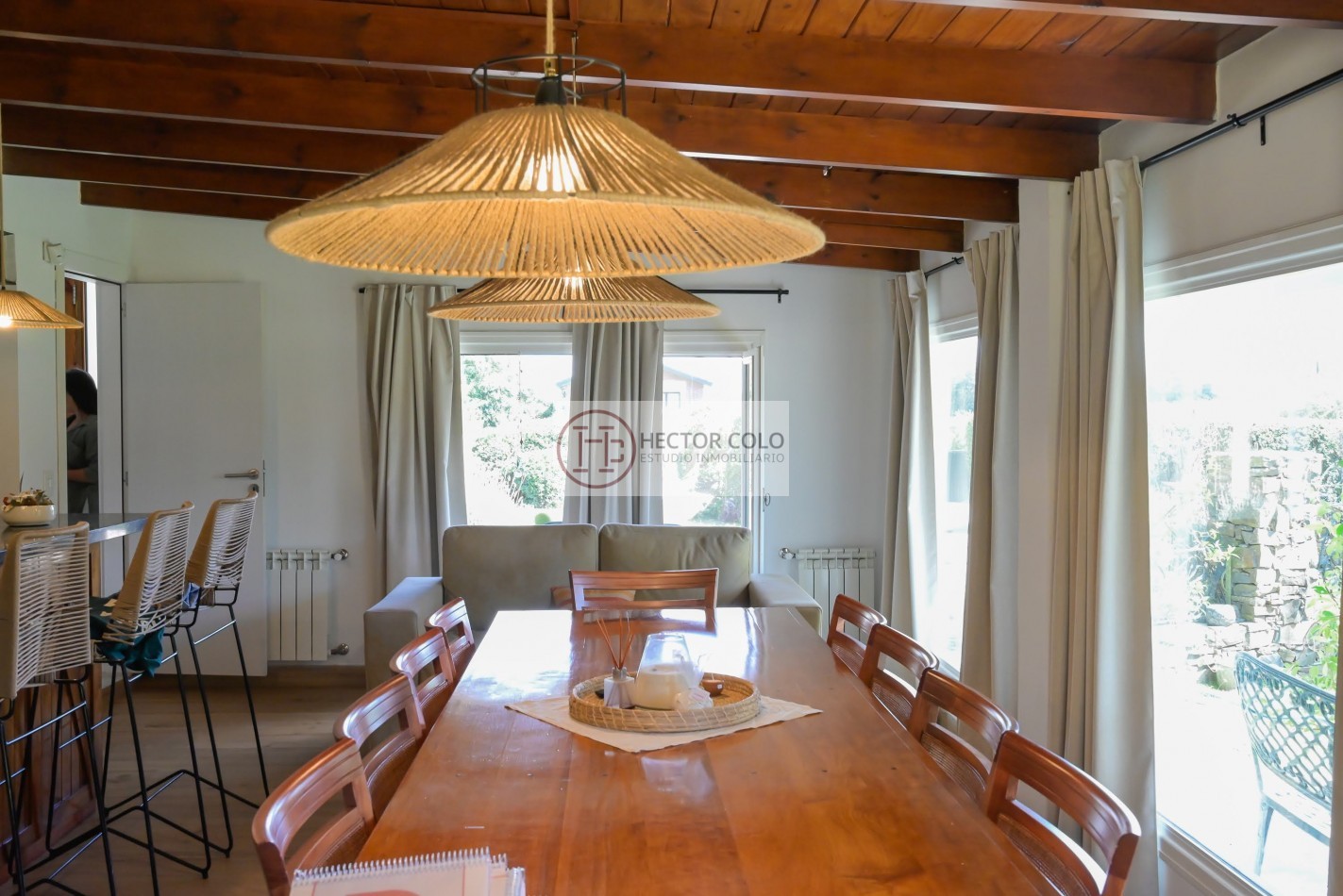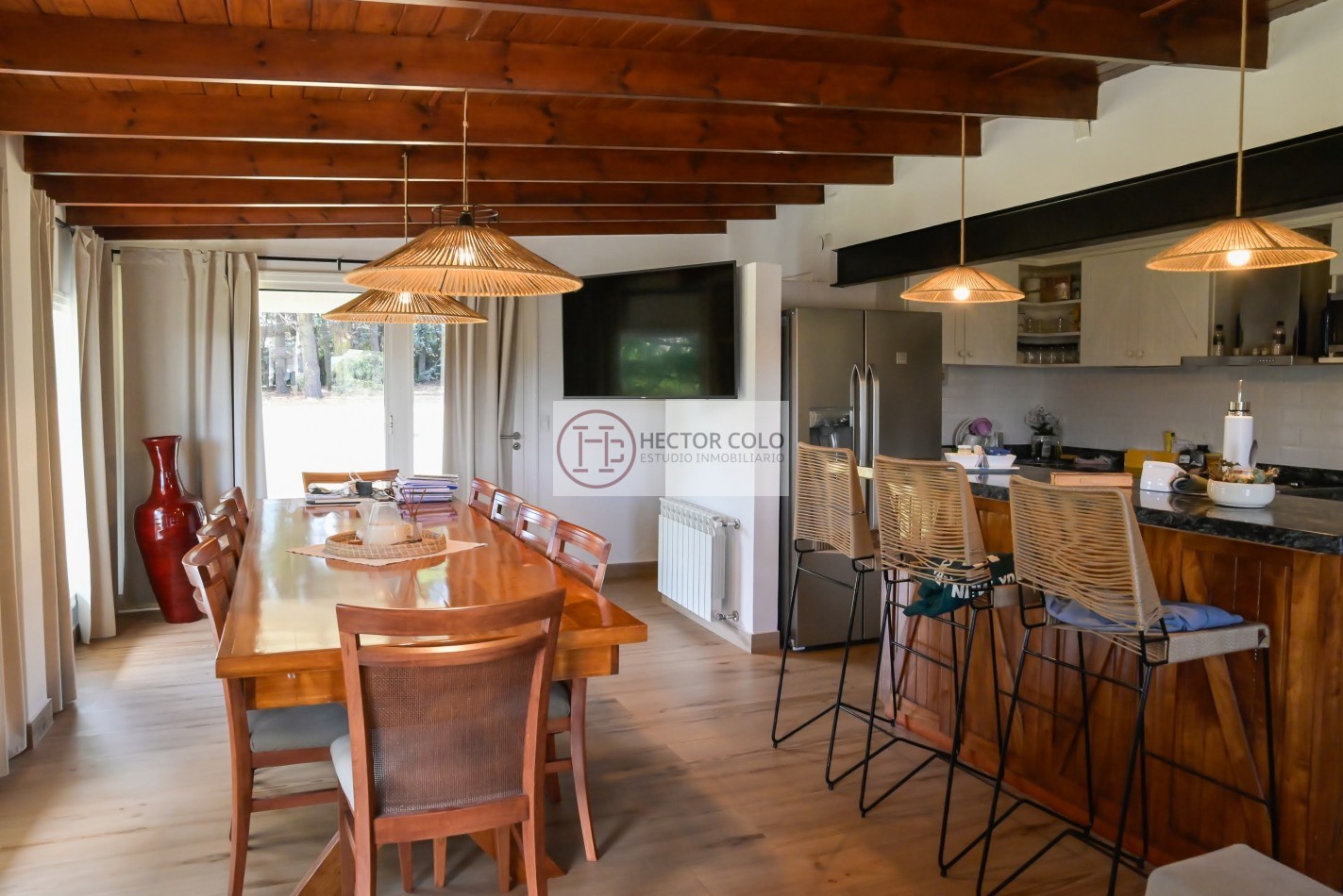 En Planta Baja: Amplia cocina comedor con grandes ventanales y vistas abiertas al jardín, logrando una conexión directa con el entorno verde. Parrilla interior integrada. Living comedor de generosas dimensiones.